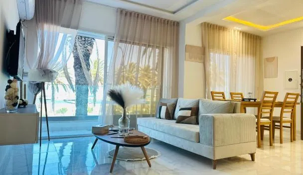 Beachfront Apartment 105- Hotel Andalucia se nachází v destinaci Bizerte a poskytuje zahradu, soukromou pláž, sdílený lounge a ubytování s bezplatným Wi-Fi a výhledem na bazén.