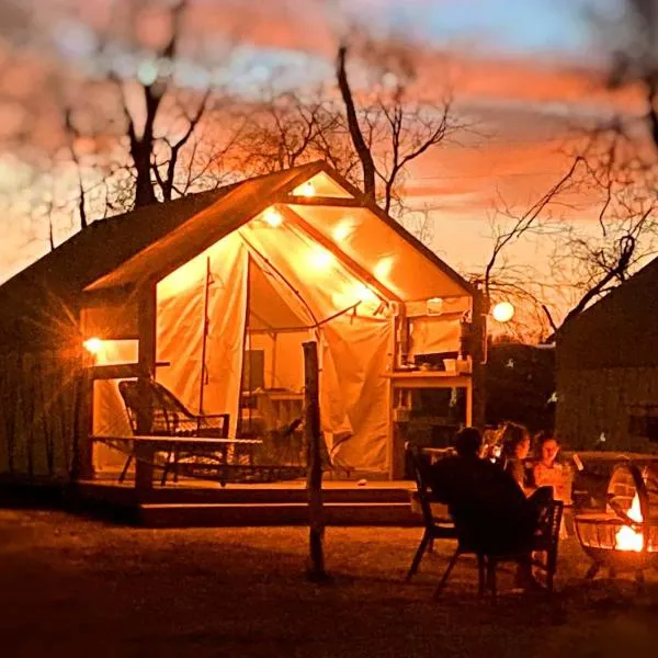 Luxury Safari Tent by the San Marcos River - Ideal for a Glamping Vacation near Kingsbury, Texas está en Staples, a 30 km de Universidad Estatal de Texas, a 44 km de Comal Park y a 44 km de Parque...