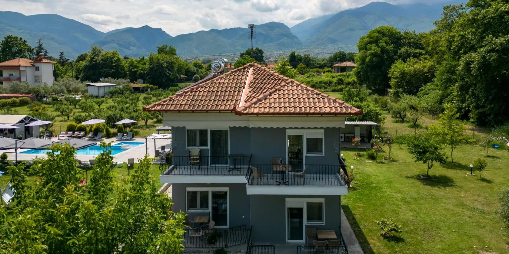 Olympus Theophilia villas nabízí venkovní bazén, zahradu a ubytování s klimatizací, terasou a bezplatným Wi-Fi. Dion se nachází 25 km odtud. Na místě je k dispozici soukromé parkoviště.